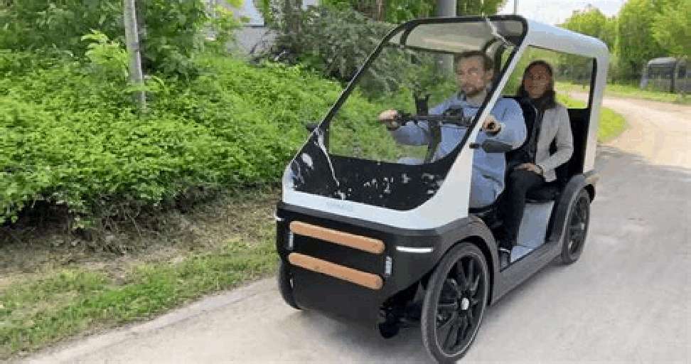 Exemple : en photo, le Karbikes permet de pédaler en position assise (pas besoin d'équilibre et un grand confort) tout en ayant une assistance électrique 25 km/h avec un toit et une banquette arrière (2 enfants ou un adulte en plus du chauffeur). Il est fabriqué en Alsace par Nicolas Vançon et Gaëlle Richard. Un véhicule idéal pour nos petits trajets quotidien quand on sait que 9 automobiliste sur 10 sont seul dans leur voiture pour se rendre au travail et que 60% de nos trajets quotidien font moins de 10 km !
