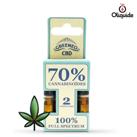 Chaque cartouche est préremplie avec 0,5 ml d’e-liquide CBD Full Spectrum fortement concentré, prêt à l’emploi. La recette est garantie sans Propylène Glycol ni Glycérine Végétale, assurant un rendu aromatique propre et fidèle.Elles sont proposées en plusieurs saveurs : Ananas, Fruits Rouges, Menthe, Tutti Frutti et Original. Le remplacement des cartouches est simple, rapide et sans fuite. Lorsqu’une cartouche est vide, retirez-la et vissez simplement une cartouche neuve pour continuer à vapoter. Si le taux de THC est conforme à la législation européenne en vigueur (<0,3 %), la concentration en cannabinoïdes de 70% en fait un produit d'exception. Voici le détail :