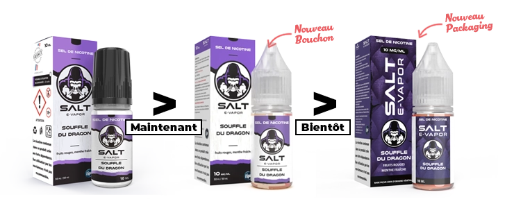 Lips vient de remplacer tous ses bouchons de fioles par les fameux bouchons Gorilla. Donc ne soyez pas surpris si vous n'avez plus les bouchons noirs sur vos fioles Salt E-vapor. Et ça ne s'arrête pas là puisque, très bientôt, c'est tout le packaging des e-liquides Salt E-Vapor qui va changer. Ça va arriver progressivement sur Oliquide. Par contre, il est entendu que les recettes des e-liquides, elles, n'ont pas changé !